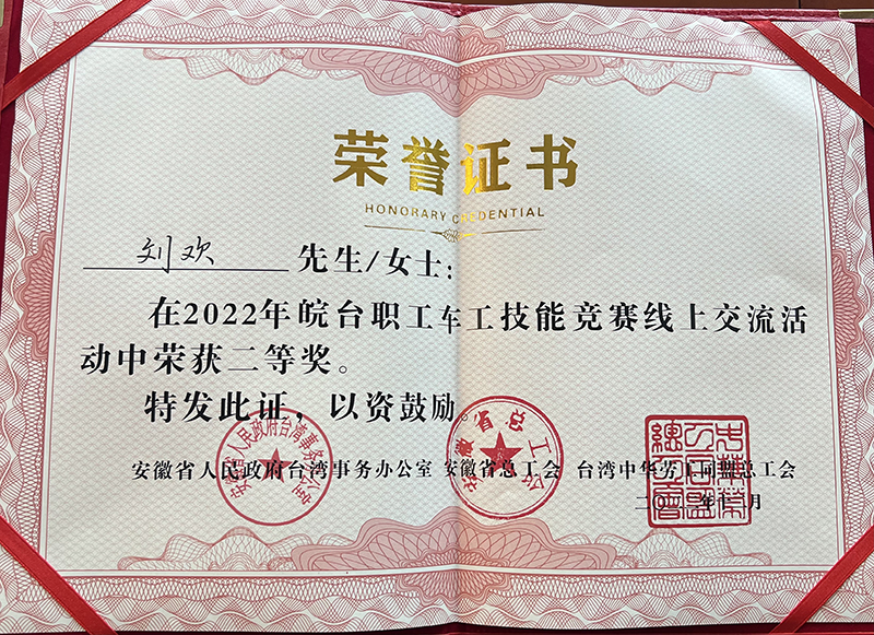 2022年12月10-11日,由安徽省人民政府臺灣事務(wù)辦公室、省總工會、臺灣中華勞工同盟總工會共同舉辦了皖臺職工技能競賽線上交流活動,我司重裝事業(yè)部劉歡同志代表馬鞍山市參賽,并在車工項(xiàng)目中取得第二名的好成績!