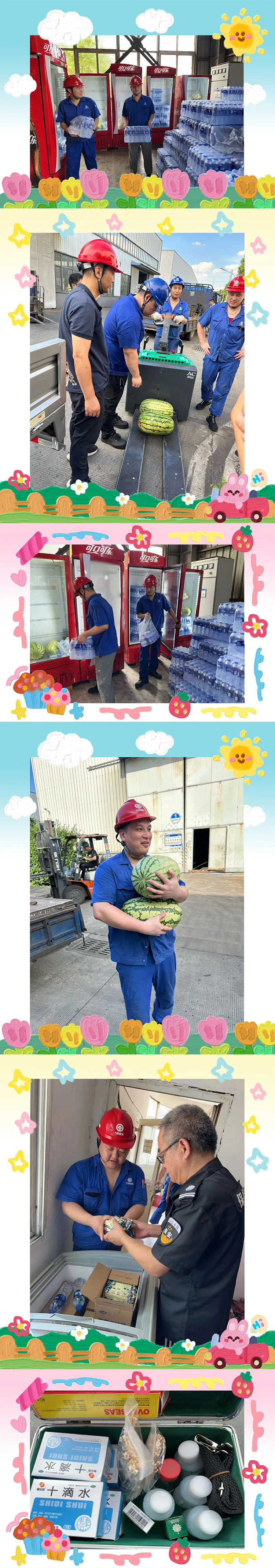 面對高溫考驗,公司工會開展夏季送清涼活動,利用各種措施進行防暑降溫。在車間設立空調(diào)24小時開放的員工休息室,在現(xiàn)場增設存放冰鎮(zhèn)飲料的冷藏柜,配備風扇進行降溫,配發(fā)含有藿香正氣液、風油精、人丹、十滴水、云南白藥等藥品的防暑降溫藥品箱,為一線員工發(fā)放西瓜、冰棒,在員工食堂供應自助飲用的綠豆湯。夏季送清涼活動為員工們在炎炎夏日里送上一份關愛,添上一份“涼意”,確保員工平安度夏。