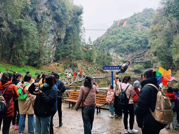 午餐后,大家繼續(xù)出發(fā)前往位于安徽省寧國市寧墩鎮(zhèn)的“華東大裂谷”?!叭A東大裂谷”為天然的大裂谷構(gòu)造,景區(qū)風(fēng)光秀麗。竹海、茶園、石浪、裂谷,大家時而駐足仰望、時而俯瞰。徒步中,歡聲笑語交織,峭壁棧道上的互相攙扶、攝影留念,盡顯女同胞們的溫情默契。