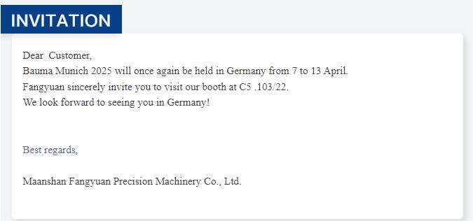 2025年4月7-13日,工程機(jī)械領(lǐng)域的國際頂級(jí)盛會(huì),第34屆德國慕尼黑BAUMA展,將在慕尼黑新國際博覽中心震撼啟幕。德國慕尼黑工程機(jī)械展-寶馬展(BAUMA)是全球規(guī)模最大、最具影響力的國際工程機(jī)械、建材機(jī)械、礦山機(jī)械行業(yè)專業(yè)展覽會(huì)。是了解和評(píng)價(jià)工程機(jī)械行業(yè)發(fā)展相關(guān)技術(shù)進(jìn)步的重要標(biāo)尺,為規(guī)劃開拓國際市場的工礦機(jī)械企業(yè)搭建了良好的平臺(tái)。 方圓精密誠摯邀請(qǐng)您蒞臨我們的展位,期待與您面對(duì)面交流,探討合作機(jī)會(huì)。您的光臨將是我們莫大的榮幸!